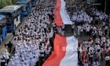 Peserta membentangkan bendera merah putih di kawasan Patung Kuda, Jakarta, Ahad (28/8/2022). Sebanyak 50.000 orang membentangkan bendera merah putih sepanjang 1.700 meter dari kawasan Monas hingga Bundaran HI. Kegiatan tersebut merupakan rangkaian dalam memperingati Hari Kemerdekaan Indonesia dengan tema (FOTO : Republika/Thoudy Badai)