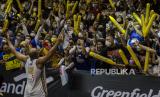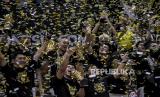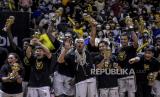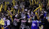 Suporter Satria Muda Pertamina Jakarta merayakan kemenangan usai mengalahkan Pelita Jaya Bakrie Jakarta dalam gim kedua Final IBL Tokopedia 2022 di Gor C-Tra Arena Bandung, Kota Bandung, Ahad (28/8/2022). Satria Muda Pertamina Jakarta berhasil menjadi juara IBL Tokopedia 2022 usai mengalahkan Pelita Jaya Bakrie Jakarta dengan skor 89-74. Republika/Abdan Syakura (FOTO : REPUBLIKA/ABDAN SYAKURA)