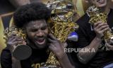 Pebasket Satria Muda Pertamina Jakarta Brachon Lanalt Griffin mengangkat trofi usai mengalahkan Pelita Jaya Bakrie Jakarta dalam gim kedua Final IBL Tokopedia 2022 di Gor C-Tra Arena Bandung, Kota Bandung, Ahad (28/8/2022). Satria Muda Pertamina Jakarta berhasil menjadi juara IBL Tokopedia 2022 usai mengalahkan Pelita Jaya Bakrie Jakarta dengan skor 89-74. Republika/Abdan Syakura (FOTO : REPUBLIKA/ABDAN SYAKURA)
