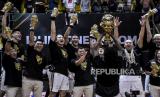 Sejumlah pebasket Satria Muda Pertamina Jakarta bersama ofisial mengangkat trofi usai mengalahkan Pelita Jaya Bakrie Jakarta dalam gim kedua Final IBL Tokopedia 2022 di Gor C-Tra Arena Bandung, Kota Bandung, Ahad (28/8/2022). Satria Muda Pertamina Jakarta berhasil menjadi juara IBL Tokopedia 2022 usai mengalahkan Pelita Jaya Bakrie Jakarta dengan skor 89-74. Republika/Abdan Syakura (FOTO : REPUBLIKA/ABDAN SYAKURA)