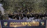 Sejumlah pebasket Satria Muda Pertamina Jakarta bersama ofisial mengangkat trofi usai mengalahkan Pelita Jaya Bakrie Jakarta dalam gim kedua Final IBL Tokopedia 2022 di Gor C-Tra Arena Bandung, Kota Bandung, Ahad (28/8/2022). Satria Muda Pertamina Jakarta berhasil menjadi juara IBL Tokopedia 2022 usai mengalahkan Pelita Jaya Bakrie Jakarta dengan skor 89-74. (FOTO : REPUBLIKA/ABDAN SYAKURA)