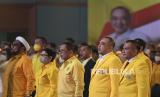 Sekjen Partai Golkar Lodewijk F Paulus (kanan) didampingi Bendahara Umum Dito Ganinduto (ketiga kanan), Ketua DPD DKI Jakarta Ahmed Zaki Iskandar (kedua kanan) Wakil Ketua Umum DPP Nurul Arifin (kedua kiri) dan Tenaga Ahli Utama Kantor Staf Presiden (KSP), Ali Mochtar Ngabalin (kiri) menyanyikan lagu Indonesia Raya saat Rapat Kerja Daerah (Rakerda) sekaligus Rapat Pimpinan Daerah (Rapimda) di Jakarta Convention Center, Senayan, Jakarta, Minggu (28/8/2022). Dalam Rakerda tersebut Sekjen Partai Golkar Lodewijk F Paulus resmi melantik pengurus DPD Partai Golkar DKI Jakarta masa bakti 2022-2025. (FOTO : ANTARA FOTO/M Risyal Hidayat)