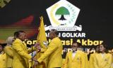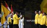 REPUBLIKA.CO.ID, JAKARTA -- Sekjen Partai Golkar Lodewijk F Paulus (kiri) menyerahkan bendera Partai Golkar kepada Ketua DPD DKI Jakarta Ahmed Zaki Iskandar (kedua kiri) saat pelantikan dalam Rapat Kerja Daerah (Rakerda) sekaligus Rapat Pimpinan Daerah (Rapimda) di Jakarta Convention Center, Senayan, Jakarta, Ahad (28/8/2022). Dalam Rakerda tersebut Sekjen Partai Golkar Lodewijk F Paulus resmi melantik pengurus DPD Partai Golkar DKI Jakarta masa bakti 2022-2025.