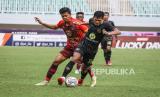 Pesepak bola Rans Nusantara FC Moh Edo (kiri) berebut bola dengan pesepak bola Barito Putera Afdal Yusra (kanan) dalam pertandingan Liga 1 di Stadion Pakansari, Kabupaten Bogor, Jawa Barat, Senin (29/8/2022). Rans Nusantara FC mengalahkan Barito Putera dengan skor 2-1. (FOTO : ANTARA /Asprilla Dwi Adha)