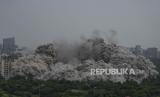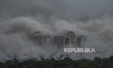 Awan debu naik saat menara apartemen kembar diratakan dengan tanah di Noida, pinggiran New Delhi, India, Minggu, 28 Agustus 2022. Pembongkaran dilakukan setelah pengadilan tinggi negara itu menyatakan bangunan itu ilegal karena melanggar norma bangunan. Menara 32 lantai dan 29 lantai, yang dibangun oleh pembangun swasta belum ditempati dan menjadi struktur tertinggi di India yang akan diratakan dengan tanah. (FOTO : AP/Altaf Qadri)