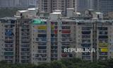 Balkon bangunan tempat tinggal terdekat ditutupi dengan plastik untuk memblokir debu selama pembongkaran terkontrol menara apartemen kembar bertingkat di Noida, pinggiran New Delhi, India, Minggu, 28 Agustus 2022. Pembongkaran dilakukan setelah pengadilan tinggi negara itu menyatakan mereka ilegal karena melanggar norma bangunan. Menara 32 lantai dan 29 lantai, yang dibangun oleh pembangun swasta belum ditempati dan menjadi struktur tertinggi di India yang akan diratakan dengan tanah. (FOTO : AP/Altaf Qadri)