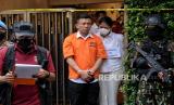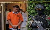 Tersangka mantan Kadiv Propam Polri Irjen Ferdy Sambo mengenakan pakaian tahanan bersama istrinya Putri Chandrawathi saat mengikuti rekonstruksi di rumah dinas Ferdy Sambo di Kompleks Polri Duren Tiga, Jalan Duren Tiga Utara I, Jakarta Selatan, Selasa (30/8/2022). Mabes Polri menggelar rekonstruksi kasus dugaan pembunuhan Brigadir J sebanyak 78 adegan secara runut mulai dari peristiwa awal di Magelang Jawa Tengah sebanyak 16 adegan, di rumah pribadi Ferdy Sambo di Jalan Saguling III, Jakarta Selatan 35 adegan dan di rumah dinas sebanyak 27 adegan. Rekonstruksi tersebut juga menghadirkan lima tersangka diantaranya Ferdy Sambo, Putri Chandrawathi, Bharada Richard Eliezer atau Bharada E, Bripka Ricky Rizal atau RR, serta Kuat Maruf. Republika/Thoudy Badai (FOTO : Republika/Thoudy Badai)
