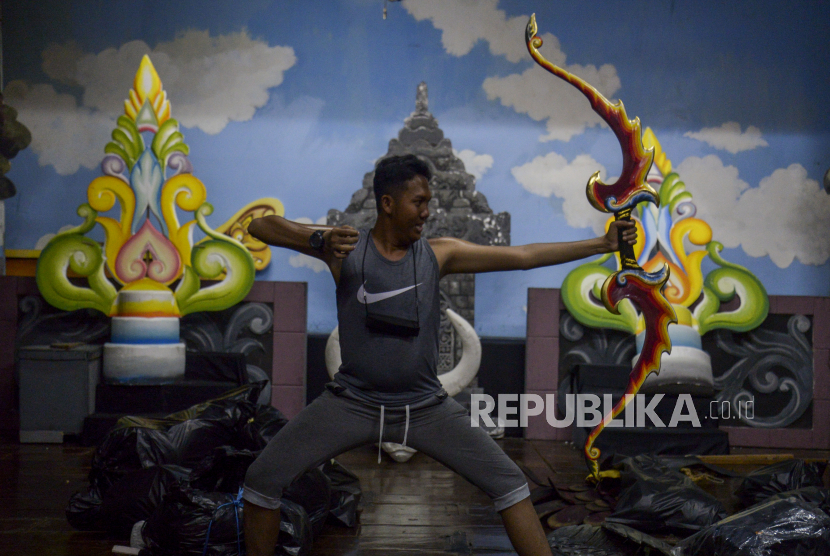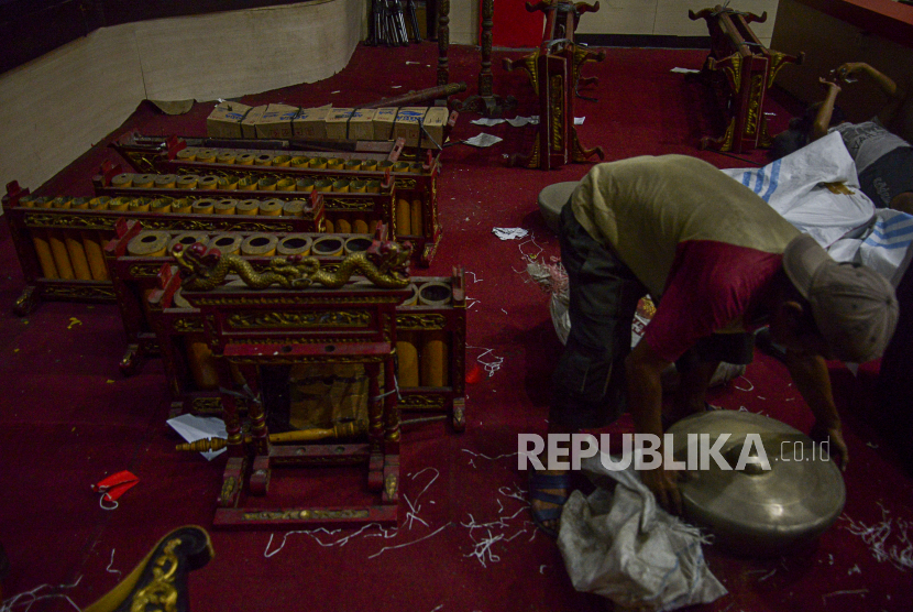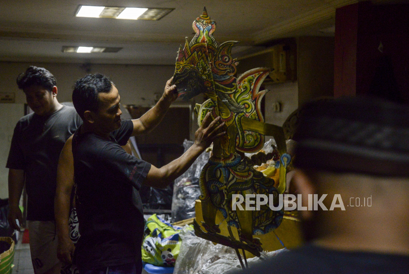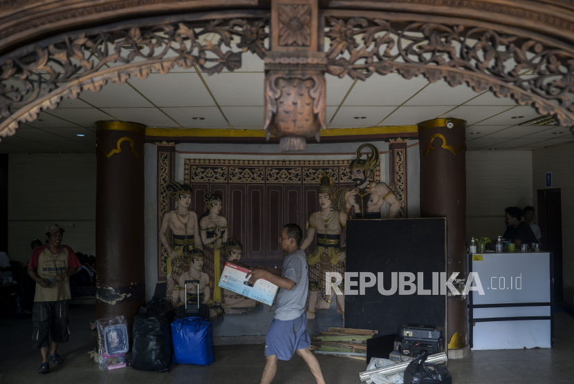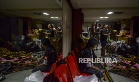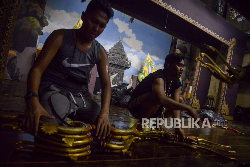 REPUBLIKA.CO.ID,JAKARTA -- Anggota Wayang Orang Bharata mengemas perlengkapan pementasan di Gedung Wayang Orang Bharata, Senen, Jakarta, Selasa (30/8/2022).