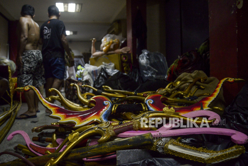 Perlengkapan Wayang Orang Bharata yang akan dikemas di Gedung Wayang Orang Bharata, Senen, Jakarta, Selasa (30/8/2022). Perlengkapan untuk pertunjukan wayang orang tersebut dikemas untuk dipindahkan sementara jelang renovasi Gedung Wayang Orang Bharata yang akan dimulai pada awal September. Republika/Putra M. Akbar (FOTO : Republika/Putra M. Akbar)