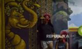 Anggota Wayang Orang Bharata berpose disela mengemas perlengkapan pementasan di Gedung Wayang Orang Bharata, Senen, Jakarta, Selasa (30/8/2022). Perlengkapan untuk pertunjukan wayang orang tersebut dikemas untuk dipindahkan sementara jelang renovasi Gedung Wayang Orang Bharata yang akan dimulai pada awal September. Republika/Putra M. Akbar (FOTO : Republika/Putra M. Akbar)