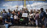 Komandan KRI Bima Suci-945 Letkol Laut (P) Muhammad Sati Lubis (tengah) berfoto bersama Warga Negara Indonesia (WNI) yang tinggal di Townsville, Australia di atas geladak KRI Bima Suci-945 di Port Of Townsville, Australia, Rabu (31/8/2022). KRI Bima Suci-945 bertolak menuju Sydney, Australia dengan menempuh perjalanan selama delapan hari.  (FOTO : ANTARA/Nova Wahyudi)