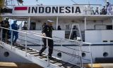 Waaspres KASAL Brigjend TNI (Mar) Endang Taryo (kanan) didampingi istri (kedua kanan) dan Atase Pertahanan RI Canberra Australia Laksamana Pertama TNI A. AG. B Oka Wirayudhatama (kiri) turun dari KRI Bima Suci-945 di Port Of Townsville, Australia, Rabu (31/8/2022). KRI Bima Suci-945 bertolak menuju Sydney, Australia dengan menempuh perjalanan selama delapan hari.  (FOTO : ANTARA/Nova Wahyudi)