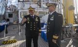 Waaspres KASAL Brigjend TNI (Mar) Endang Taryo (kiri) berbincang dengan Komandan KRI Bima Suci-945 Letkol Laut (P) Muhammad Sati Lubis (kanan) di atas geladak KRI Bima Suci-945 sebelum bertolak menuju Sydney, Australia di Port Of Townsville, Australia, Rabu (31/8/2022). KRI Bima Suci-945 bertolak menuju Sydney, Australia dengan menempuh perjalanan selama delapan hari.  (FOTO : ANTARA/Nova Wahyudi)