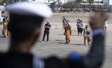 Sejumlah anggota Genderang Suling (GS) Gita Jala Taruna Akademi Angkatan Laut (AAL) Tingkat III Angkatan ke-69 tampil di Port Of Townsville, Australia, Rabu (31/8/2022). KRI Bima Suci-945 bertolak menuju Sydney, Australia dengan menempuh perjalanan selama delapan hari.  (FOTO : ANTARA/Nova Wahyudi)