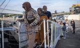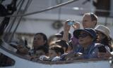 Warga Negara Indonesia (WNI) yang tinggal di Townsville, Australia menaiki tangga KRI Bima Suci-945 saat kunjungan kapal sebelum bertolak ke Sydney di Port Of Townsville, Australia, Rabu (31/8/2022). KRI Bima Suci-945 bertolak menuju Sydney, Australia dengan menempuh perjalanan selama delapan hari.  (FOTO : ANTARA/Nova Wahyudi)