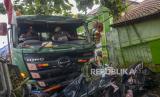 Seorang supir mengemudikan truk yang mengalami kecelakaan di Jalan Sultan Agung, Bekasi, Jawa Barat, Rabu (31/8/2022). Kecelakaan truk yang menabrak tiang BTS hingga roboh di depan SDN Kota Baru II dan III tersebut mengakibatkan 10 orang meninggal dunia dan 23 lainnya luka-luka. Republika/Putra M. Akbar (FOTO : Republika/Putra M. Akbar)