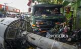 Polisi berusaha mengeluarkan truk yang mengalami kecelakaan di Jalan Sultan Agung, Bekasi, Jawa Barat, Rabu (31/8/2022). Kecelakaan truk yang menabrak tiang BTS hingga roboh di depan SDN Kota Baru II dan III tersebut mengakibatkan 10 orang meninggal dunia dan 23 lainnya luka-luka. Republika/Putra M. Akbar (FOTO : Republika/Putra M. Akbar)