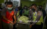 Petugas membawa jenazah korban kecelakaan truk untuk dimasukan ke mobil ambulans di RSUD Bekasi, Jawa Barat, Rabu (31/8/2022). Sebanyak tujuh jenazah korban kecelakaan truk yang menabrak tiang BTS hingga roboh dibawa ke RSUD Bekasi untuk diidentifikasi sebelum diserahkan kepada keluarga. Republika/Putra M. Akbar (FOTO : Republika/Putra M. Akbar)