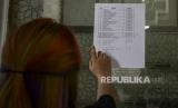 Keluarga korban kecelakaan truk melihat daftar nama korbang yang dirawat di Rumah Sakit Ananda, Bekasi, Jawa Barat, Rabu (31/8/2022). Kecelakaan truk yang menabrak tiang BTS hingga roboh di depan SDN Kota Baru II dan III saat jam istirahat sekolah tersebut mengakibatkan 10 orang meninggal dunia dan 23 lainnya luka-luka, yang mayoritas korban merupakan pelajar SD. Republika/Putra M. Akbar (FOTO : Republika/Putra M. Akbar)