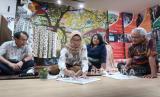 REPUBLIKA.CO.ID,JAKARTA -- Ketua Pengurus YDBA (Yayasan Dharma Bhakti Astra) Sigit P Kumala berbincang dengan Owner Batik Pratesthi Pintya Dwanita Ayu mengenai proses pembuatan ecoprint pada acara Media Gathering bersama YDBA di Jakarta, Rabu (31/08/2022).
