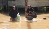 REPUBLIKA.CO.ID,ACEH BARAT -- Sejumlah warga melintasi genangan banjir di depan rumahnya yang terendam banjir di Desa Pasi Leuhan, Kecamatan Johan Pahlawan, Aceh Barat, Aceh, Jumat (2/9/2022).
