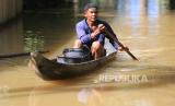 Seorang warga melintasi banjir dengan menggunakan perahunya di Desa Pasi Leuhan, Kecamatan Johan Pahlawan, Aceh Barat, Aceh, Jumat (2/9/2022). Tingginya intensitas hujan menyebabkan empat sungai dikawasan itu meluap dan merendam puluhan rumah warga serta ratusan hektare lahan pertanian/perkebunan dengan ketinggian air 30 cm sampai 100 cm di Kecamatan Arongan Lam Balek, Woyla Barat, Bubon, Kaway XVI, Meureubo, Samatiga dan Kecamatan Johan Pahlawan. (FOTO : ANTARA/Syifa Yulinnas)