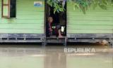 Seorang warga berada didalam rumahnya yang terendam banjir di Desa Pasi Leuhan, Kecamatan Johan Pahlawan, Aceh Barat, Aceh, Jumat (2/9/2022). Tingginya intensitas hujan menyebabkan empat sungai di kawasan itu meluap dan merendam puluhan rumah warga serta ratusan hektare lahan pertanian/perkebunan dengan ketinggian air 30 cm sampai 100 cm di Kecamatan Arongan Lam Balek, Woyla Barat, Bubon, Kaway XVI, Meureubo, Samatiga dan Kecamatan Johan Pahlawan. (FOTO : ANTARA/Syifa Yulinnas)