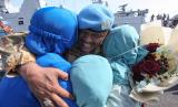 Personel TNI Angkatan Laut yang tergabung dalam Satuan Tugas (Satgas) Maritime Task Force (MTF) TNI Konga XXVIII-M/UNIFIL TA 2020 memeluk keluarganya usai turun dari KRI Sultan Iskandar Muda-367 di Koarmada II, Surabaya, Jawa Timur, Sabtu (3/9/2022). Satgas yang telah melaksanakan misi perdamaian dunia di Lebanon sejak bulan April 2021 sampai Agustus 2022 itu telah tiba di Surabaya. (FOTO : ANTARA/Didik Suhartono)