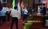 Mahasiswa baru Universitas Islam Bandung (Unisba) bersama-sama memakai jas almamater setelah diresmikan oleh Rektor Unisba Prof Edi Setiadi pada Pelantikan dan Taaruf Mahasiswa Baru Tahun Akademik 2022/2023 di Aula Unisba, Jalan Tamansari, Kota Bandung, Senin (5/9). Sebanyak 2.378 mahasiswa baru Unisba mengikuti prosesi pelantikan yang dilaksanakan secara hybrid. (FOTO : Edi Yusuf/Republika)