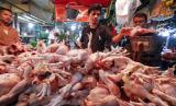 REPUBLIKA.CO.ID,BOGOR -- Pedagang ayam potong melayani pembeli di Pasar Cibinong, Kabupaten Bogor, Jawa Barat, Selasa (6/9/2022).