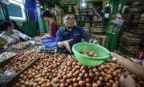 Pedagang telur ayam melayani pembeli di Pasar Cibinong, Kabupaten Bogor, Jawa Barat, Selasa (6/9/2022). Menurut pedagang hampir semua bahan pangan naik mengikuti pemberlakuan harga baru BBM, diantaranya cabai merah keriting naik dari harga Rp60 ribu menjadi Rp75 ribu per kilogram, bawang merah naik dari Rp20 ribu menjadi Rp28 ribu per kilogram, cabai rawit hijau naik dari harga Rp38 ribu menjadi Rp50 ribu per kilogram, ayam ras naik dari Rp25 ribu menjadi Rp28 ribu per kilogram dan telur ayam ras naik dari Rp25 ribu menjadi Rp30 ribu per kilogram. (FOTO : ANTARA/Yulius Satria Wijaya)