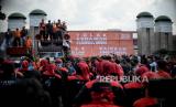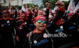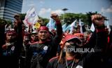 Massa buruh yang tergabung dari berbagai elemen menggelar aksi di depan Gedung DPR MPR RI di Jakarta, Selasa (6/9/2022). Dalam aksinya mereka membawa sejumlah tuntutan diantaranya menolak kenaikan harga bahan bakar minyak (BBM), menolak pembahasan Omnibus Law UU Cipta Kerja serta menuntut pemerintah untuk segera meningkatkan upah minimum sebesar 10 hingga 13 persen pada tahun 2023. Republika/Thoudy Badai (FOTO : Republika/Thoudy Badai)