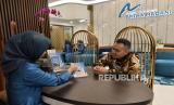 Karyawan menjelaskan produk perbankan kepada nasabah di gedung Bank Syariah Artha Madani yang baru diresmikan di Bekasi, Jawa Barat, Rabu (7/9/2022). BPR Syariah Artha Madani meresmikan kantor baru yang dihadirkan dengan konsep personal banking syariah. Konsep ini dihadirkan untuk meningkatkan kepercayaan dan kenyamanan kepada nasabah untuk mendapatkan layanan jasa keuangan syariah khususnya di kota Bekasi dan sekitarnya. (FOTO : Republika/Edwin Dwi Putranto)