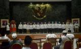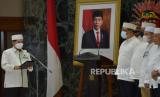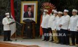 Ketua Umum Ikatan Persaudaraan Haji Indonesia (IPHI) Ismed Hasan Putro membacakan naskah pelantikan saat melantik Pengurus Wilayah DKI Jakarta IPHI di Balai Agung, Jakarta, Jumat (9/9/2022). Mohamad Taufik dilantik sebagai Ketua IPHI DKI Jakarta bersama pengurus IPHI DKI Jakarta lainya masa bakti tahun 2022-2026.  (FOTO : Republika/Prayogi)