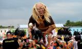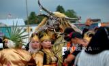 Kirab bekakak atau ogoh-ogoh saat Saparan Bekakak di Gamping, Sleman, Yogyakarta, Jumat (9/9/2022). Setalah ditiadakan selama pandemi Covid-19 lalu, upacara Saparan Bekakak kembali diadakan kembali di Gamping. Tradisi adat. masyarakat gamping ini menjadi salah satu daya tarik wisatawan, karena adanya kirab bekakak yang diadakan setahun sekali setiap Bulan Safar. (FOTO : Republika/Wihdan Hidayat)
