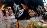 Warga memakai pakaian tradisional mengikuti upacara Saparan Bekakak di Gamping, Sleman, Yogyakarta, Jumat (9/9/2022). Setalah ditiadakan selama pandemi Covid-19 lalu, upacara Saparan Bekakak kembali diadakan kembali di Gamping. Tradisi adat. masyarakat gamping ini menjadi salah satu daya tarik wisatawan, karena adanya kirab bekakak yang diadakan setahun sekali setiap Bulan Safar. (FOTO : Republika/Wihdan Hidayat)