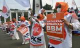 Simpatisan Partai Keadilan Sejahtera (PKS) melakukan orasi untuk menolak kenaikan harga bahan bakar minyak (BBM) dalam aksi di Salatiga, Jawa Tengah, Sabtu (10/9/2022). Dalam aksi damai tersebut, kader dan simpatisan PKS Salatiga itu berharap kepada pemerintah dapat menurunkan kembali harga bahan bakar minyak agar tidak berdampak pada kenaikan harga kebutuhan lainnya. (FOTO : ANTARA/Aloysius Jarot Nugroho)
