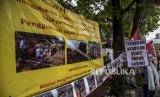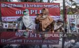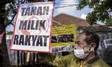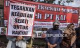 Massa yang tergabung dalam Aliansi Penghuni Rumah dan Tanah Negara (APRTN) melakukan aksi di depan lokasi penertiban aset PT KAI di Jalan Laswi, Batununggal, Kota Bandung, Senin (12/9/2022). Dalam aksi tersebut mereka meminta PT KAI DAOP 2 Bandung untuk menghentikan segala bentuk upaya pengosongan paksa atau eksekusi sepihak serta bertanggung jawab memberikan ganti rugi kepada warga yang terdampak. (FOTO : REPUBLIKA/ABDAN SYAKURA)