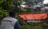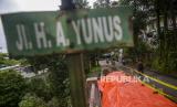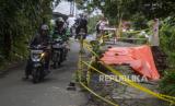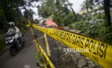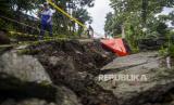 Garis polisi terpasang di dekat jalan longsor di Jalan H. A. Yunus, Kota Bogor, Jawa Barat, Senin (12/9/2022). Jalan alternatif penghubung Kota Bogor dan Kabupaten Bogor tersebut longsor yang diakibatkan tingginya curah hujan sehingga hanya dapat dilewati kendaraan roda dua. (FOTO : Republika/Putra M. Akbar)