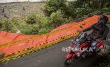 Pengendara motor melintas di dekat jalan longsor yang ditutupi terpal di Jalan H. A. Yunus, Kota Bogor, Jawa Barat, Senin (12/9/2022). Jalan alternatif penghubung Kota Bogor dan Kabupaten Bogor tersebut longsor yang diakibatkan tingginya curah hujan sehingga hanya dapat dilewati kendaraan roda dua. (FOTO : Republika/Putra M. Akbar)