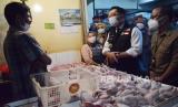 Gubernur Jawa Barat Ridwan Kamil berbincang dengan pedagang ayam saat kunjungan ke Pasar Tradisional Baltos, Kota Bandung, untuk memantau harga kebutuhan pokok pasca kenaikan BBM, Senin (12/9). Dalam kegiatan itu, Gubernur Jawa Barat menemukan sejumlah fenomena seperti produk mengecil, kenaikan harga bahan makanan perikanan dan pembeli daging sapi maupun ayam mengalami penurunan meski harga tidak mengalami kenaikan. (FOTO : Edi Yusuf/Republika)