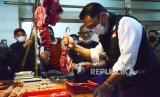 Gubernur Jawa Barat Ridwan Kamil berbincang dengan pedagang daging sapi saat kunjungan ke Pasar Tradisional Baltos, Kota Bandung, untuk memantau harga kebutuhan pokok pasca kenaikan BBM, Senin (12/9). Dalam kegiatan itu, Gubernur Jawa Barat menemukan sejumlah fenomena seperti produk mengecil, kenaikan harga bahan makanan perikanan dan pembeli daging sapi maupun ayam mengalami penurunan meski harga tidak mengalami kenaikan. (FOTO : Edi Yusuf/Republika)