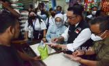 REPUBLIKA.CO.ID, BANDUNG -- Gubernur Jawa Barat Ridwan Kamil berbincang dengan pedagang beras saat kunjungan ke Pasar Tradisional Baltos, Kota Bandung, untuk memantau harga kebutuhan pokok pasca kenaikan BBM, Senin (12/9).