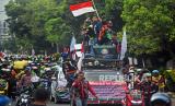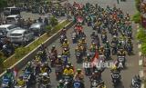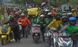 REPUBLIKA.CO.ID, SERANG -- Sejumlah pengemudi ojek online (ojol) melakukan konvoi saat berunjuk rasa di alun-alun Serang, Banten, Senin (12/9/2022). Mereka menuntut kenaikan pendapatan serta peningkatan kesejahteraan setelah pemerintah menaikkan harga bahan bakar minyak (BBM).