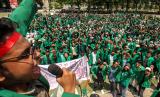Koordinator aksi gabungan Aliansi Mahasiswa Universitas Malikussaleh (Unimal) berorasi sebelum menuju gedung DPRK untuk berunjuk rasa menolak kenaikan harga Bahan Bakar Minyak (BBM) di Lhokseumawe, Aceh, Senin (12/9/2022). Unjuk rasa mahasiswa yang mendesak pemerintah membatalkan kenaikan harga BBM bersubsidi tersebut berakhir ricuh. (FOTO : ANTARA/Rahmad)