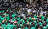 Peserta aksi dari Aliansi Mahasiswa Universitas Malikussaleh (Unimal) berusaha menerobos barikade personel Kepolisian untuk menduduki gedung DPRK saat unjuk rasa menolak kenaikan harga Bahan Bakar Minyak (BBM) bersubsidi di Lhokseumawe, Aceh, Senin (12/9/2022). Unjuk rasa mahasiswa yang mendesak pemerintah membatalkan kenaikan harga BBM bersubsidi tersebut berakhir ricuh. (FOTO : ANTARA/Galih Pradipta)
