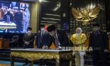 Gubernur DKI Jakarta Anies Baswedan (kedua kiri) bersama Wakil Gubernur DKI Jakarta Ahmad Riza Patria (kiri) dan Ketua DPRD DKI Jakarta Prasetyo Edi Marsudi (tengah) saat penandatanganan surat pemberhentian pada sidang paripurna di Gedung DPRD DKI Jakarta, Selasa (13/9/2022). DPRD DKI Jakarta menggelar rapat paripurna pengumuman masa akhir kepemimpinan Gubernur DKI Jakarta Anies Baswedan dan Wakil Gubernur DKI Jakarta Ahmad Riza Patria 30 hari sebelum masa tugas berakhir. (FOTO : Republika/Putra M. Akbar)