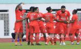 Sejumlah pesepakbola Bhayangkara FC melakukan selebrasi usai gol kedua yang dicetak Sani Rizki (kiri) ke gawang Borneo FC Samarinda pada lanjutan Liga 1 di Stadion Wibawa Mukti, Kabupaten Bekasi, Jawa Barat, Selasa (13/9/2022). Kedua tim bermain imbang 2-2. (FOTO : ANTARA/Fakhri Hermansyah)
