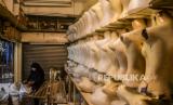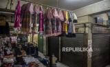 Pedagang menjahit baju di dekat kios yang tutup di Pasar Mampang Prapatan, Jakarta, Rabu (14/9/2022). Sepinya pengunjung di pasar tersebut membuat para pedagang memilih menjual atau menyewakan kiosnya dan beralih memasarkan barang dagangannya secara daring.  (FOTO : Republika/Putra M. Akbar)