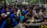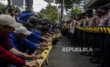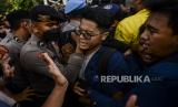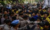 Sejumlah mahasiswa terlibat aksi saling dorong dengan polisi saat unjuk rasa di kawasan Patung Kuda, Jakarta, Kamis (15/9/2022). Unjuk rasa tersebut menuntut Pemerintah mencabut keputusan terkait kenaikan BBM, menunda proyek strategis nasional yang tidak berdampak langsung kepada masyarakat dan mengalihkan anggarannya ke subsidi BBM yang lebih berdampak pada masyarakat serta menerapkan regulasi pemakaian BBM bersubsidi secara tegas. Republika/Putra M. Akbar (FOTO : Republika/Putra M. Akbar)